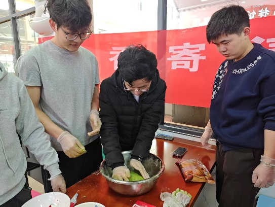 活动伊始,现场已布置好主题横幅、门型展架及各类制作物料,清明文化知识与青团传统内涵在展示区清晰呈现,营造出浓厚的节日氛围。学校食堂的面点师傅亲临现场,从和面、揉团、包馅到塑形,一步步细致演示青团的制作技巧,并耐心讲解要点与注意事项,为同学们的实践操作保驾护航。